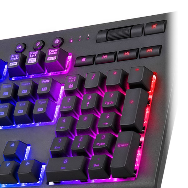 The X1 RGB uses CHERRY MX switches with built-in gold-crosspoint contacts, gold-plated contact closures, and pressure-resistant metal alloy springs for the most precise, accurate and feel for every touch. The switches also come rated with a 50-million keystroke lifespan for utmost durability. The X1 RGB Blue switch provides a crystal clear click pressure point highlighted by an audible click for tactile and precise key operations