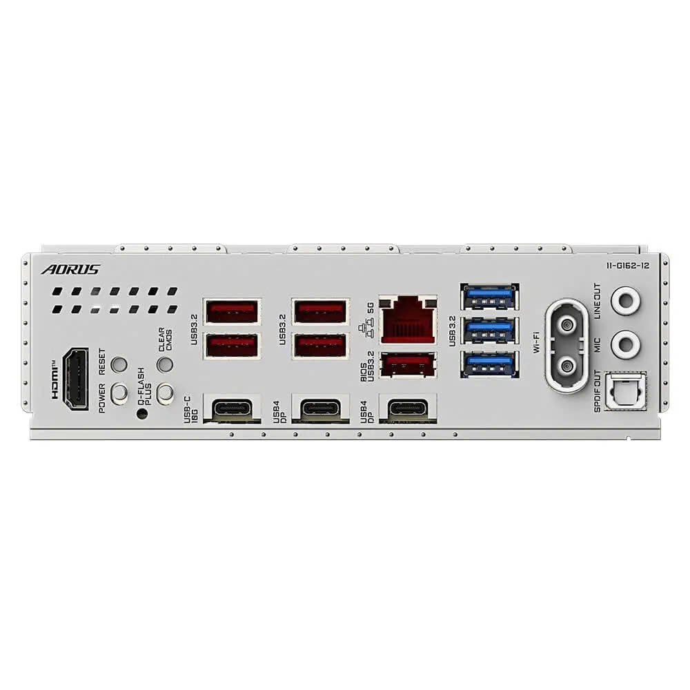 | Back Panel Connectors | 1 x HDMI port (Note) 1 x reset button 1 x power button 1 x Clear CMOS button 1 x Q-Flash Plus button 5 x USB 3.2 Gen 2 Type-A ports (red) 1 x USB Type-C® port, with USB 3.2 Gen 2 support 2 x USB4® USB Type-C® ports (DisplayPort (Note)) 1 x RJ-45 port 3 x USB 3.2 Gen 1 ports 2 x antenna connectors (2T2R) 2 x audio jacks 1 x optical S/PDIF Out connector (Note) Actual support may vary by CPU. |